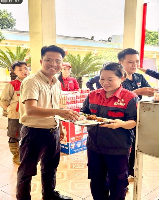 Ông Trương Trần Bảo, Phó Tổng Giám đốc Công ty TNHH Xây dựng và Phát triển nông thôn miền núi, cùng chia cơm cho người lao động